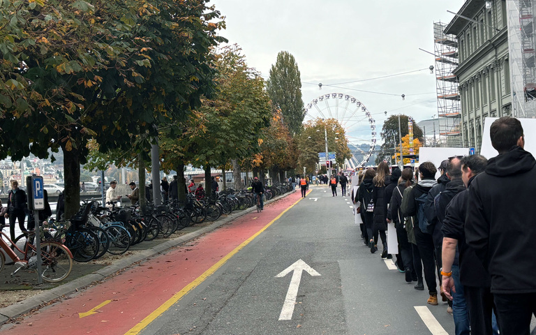 Um 14:15 Uhr setzte sich die Gruppe in Bewegung, angeführt von der Polizei, die den Marsch schützte. Die Route führte vom Musikpavillon in Richtung Bahnhof Luzern, entlang der Seebrücke und durch ruhigere Straßen zurück zum Ausgangspunkt. Einige Teilnehmer trugen Plakate, während andere Helfer Flyer an Passanten verteilten, die sich interessiert zeigten und den Erklärungen aufmerksam lauschten.