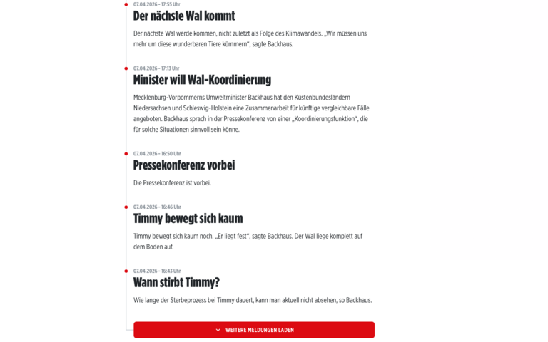 „Sonniger Tagesbeginn für Timmy“, macht heute die Bild-Zeitung gut Wetter in ihrem Spezial-Ticker über den vor der mecklenburgischen Ostseeküste gestrandeten Buckelwal. Gestern Abend um 22:28 Uhr die letzte Spätmeldung („Wichtiges Gutachten erwartet“), heute früh um 6:28 Uhr den nächsten Informationshappen: „Timmy weiterhin sehr schwach“. Am Nachmittag eine Pressekonferenz mit Mecklenburg-Vorpommerns Umwelt- und Landwirtschaftsminister Till Backhaus (SPD): „Die schlimmste Osterphase, die ich in meinem ganzen Leben miterlebt habe“, bekennt Deutschlands neuer Deichgraf mit erschöpfter Stimme.