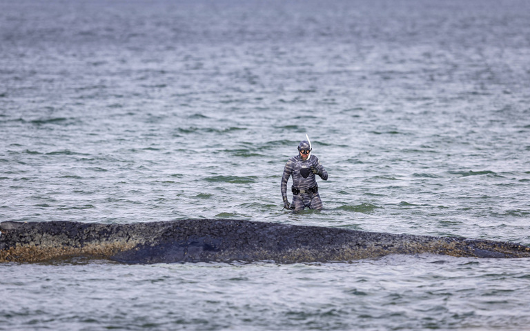 Taucher machten Unterwasseraufnahmen rund um das Tier in der Wismarbucht, vermaßen den Meeressäuger (12,35 Meter lang, 3,20 Meter breit und 1,60 Meter hoch), nahmen Wasserproben – Salzgehalt zu gering. Über zwölf Tonnen soll der Wal wiegen, ist 50 Zentimeter in den Schlick eingesunken, sein Eigengewicht drückt auf Lunge und Leber, ein Kreislaufkollaps nur eine Frage der Zeit.