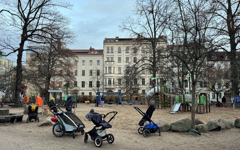 Ein Blick auf einen Spielplatz in Prenzlauer Berg – im Winter, unter der Woche und kurz vor Sonnenuntergang. Im Sommer ist hier die Hölle los