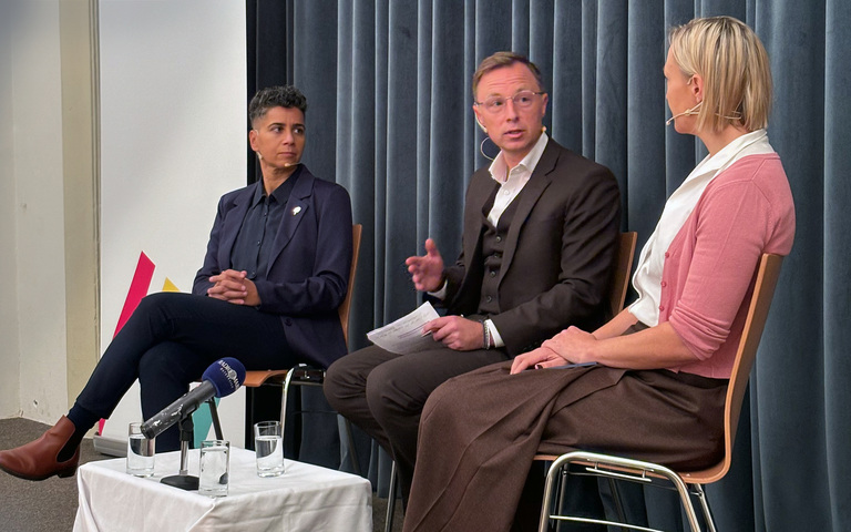 Debatte zwischen Faika El-Nagashi (l.) und Caroline Hungerlander, moderiert von Journalist Christian Böhmer
