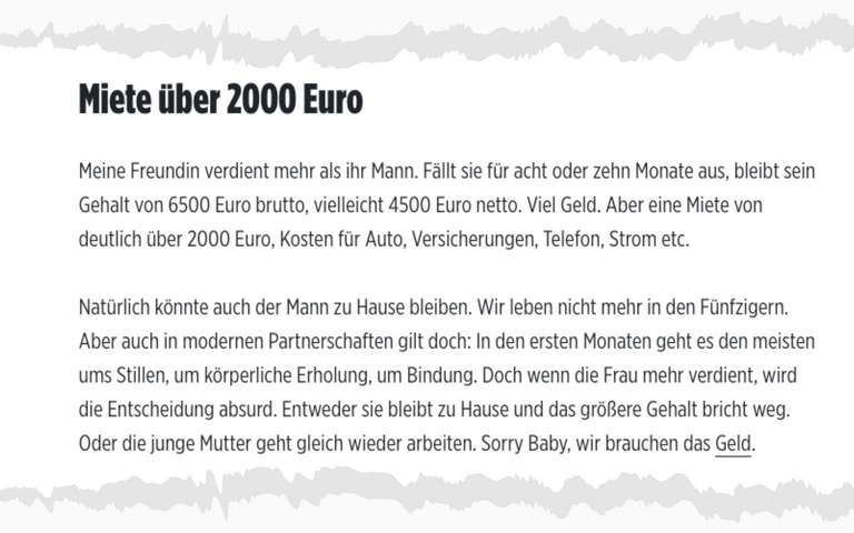 „Aber es ist auch das Einkommen von zwei Menschen, die lange studiert haben, die erst mit Ende 20 ins Berufsleben gestartet sind und erst jetzt gut verdienen. Sie haben bisher kein Vermögen aufgebaut, sondern aufgeholt: Ausbildungszeit ohne Ersparnisse, Rückzahlung des Studienkredits, private Altersvorsorge. Reich sind sie nicht. Sie sind spät dran.“