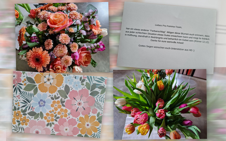 „Liebes Profemina-Team, hier ein etwas anderer ‘Farbanschlag’. Mögen diese Blumen euch erinnern, dass aus jeder schlechten Situation etwas Gutes erwachsen kann und mögt ihr fröhlich in Hoffnung, standhaft in Bedrängnis und beharrlich im Gebet sein (Römer 12,12). Danke für eure wertvolle Arbeit!