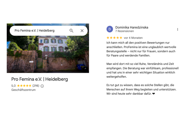 Bei den beratenen Frauen kommt die Arbeit gut an. Die Google-Bewertung der Beratungsstelle weist fünf von fünf Sternen aus. In den Rezensionen werden die Beraterinnen mit Lob überhäuft.