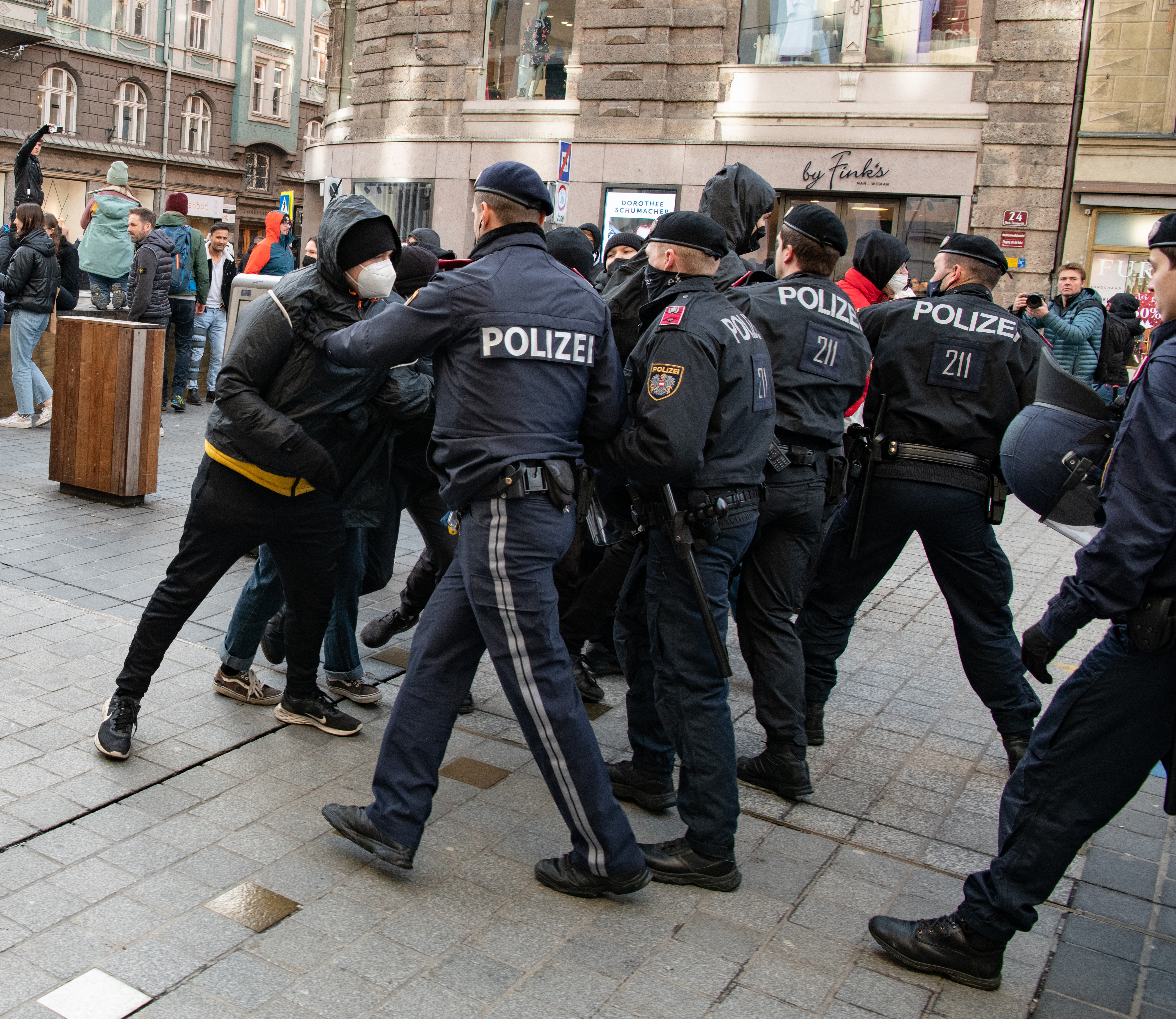 Kurz nach Beginn kesseln etwa 80 Gegendemonstranten die Kundgebung auf der Maria-Theresien-Straße von beiden Seiten ein. Die Polizei bildet Frontlinien und stellt sich schützend zwischen Kundgebungsteilnehmer und Gegendemonstranten. Aus linksextremen Kreisen bekannte Sprüche wie „My body, my choice“ und „Kein Gott, kein Staat, kein Patriarchat“ werden skandiert. Die gegen Christen gerichtete Parole „Hätt Maria abgetrieben, wärt ihr uns erspart geblieben“ ist ebenfalls zu hören. Auf einem großen Transparent liest man die Aufschrift „Patriarchat anzünden.“