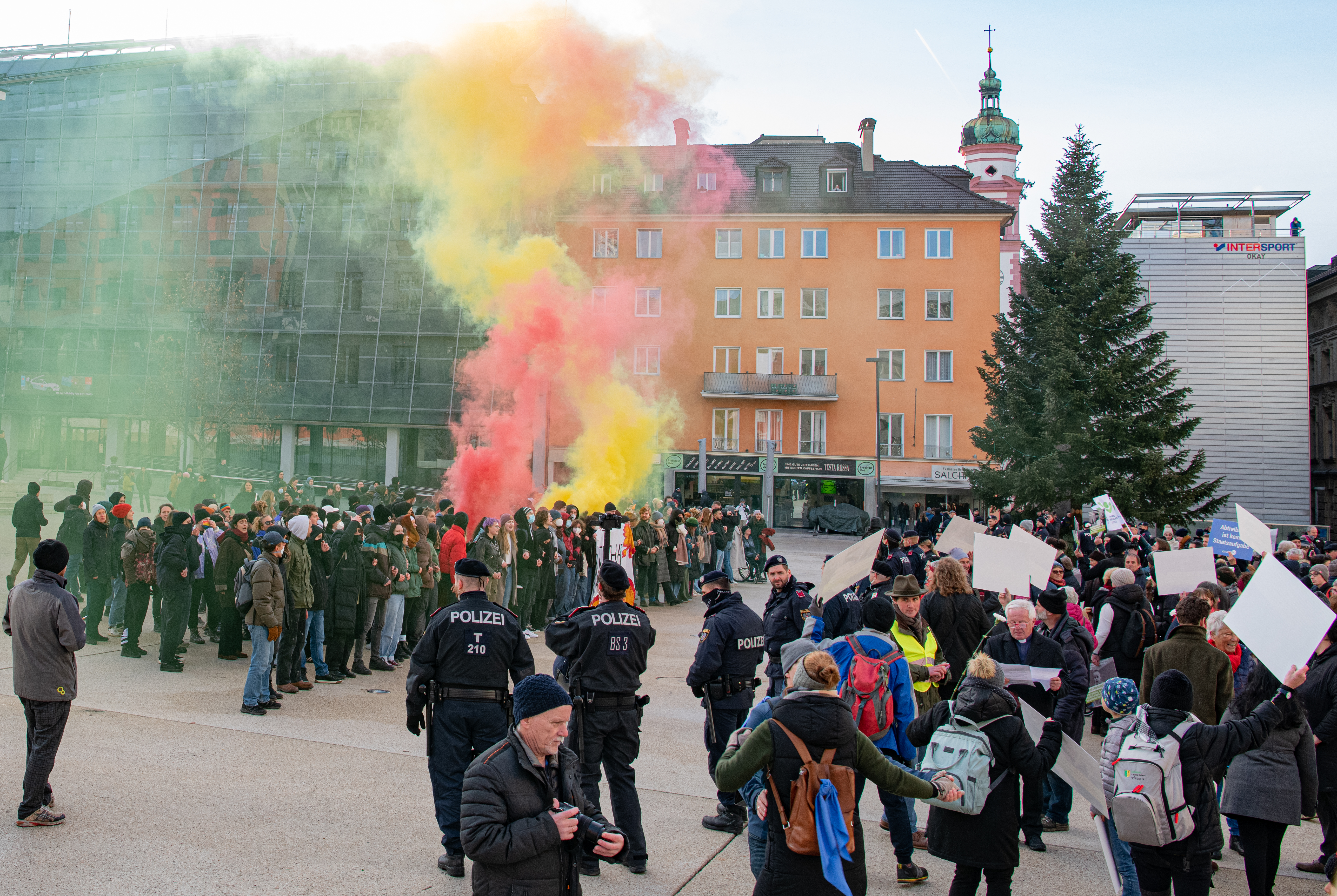 Schließlich kommt der Demonstrationszug am Eduard-Wallnöfer-Platz vor dem Tiroler Landhaus an. Dort tanzen einige Kundgebungsteilnehmer ausgelassen zur Musik, während die Gegendemonstranten bengalische Feuer anzünden und versuchen, die Kundgebung durch das Skandieren von Parolen zu stören. Leider ist keiner der Gegendemonstranten für eine Stellungnahme zu gewinnen.