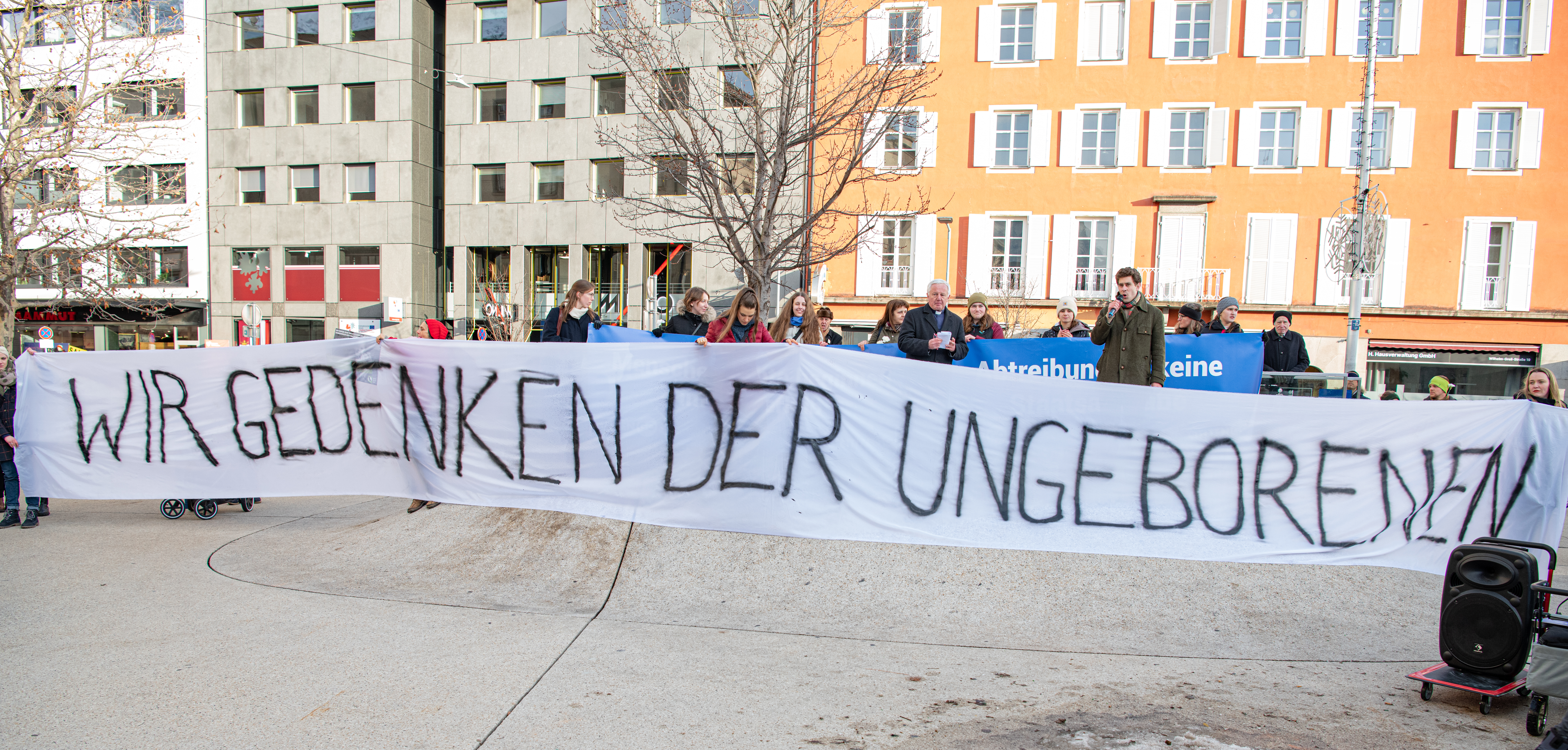 Die Kundgebungsteilnehmer setzen sich für einen kurzen Marsch durch Innsbruck in Bewegung. Träger zweier großer Transparente führen ihn an. „Abtreibung ist keine Staatsaufgabe“ und „Menschenrechte beginnen im Mutterleib“ ist darauf zu lesen.