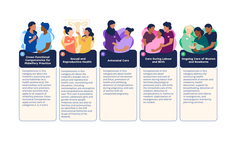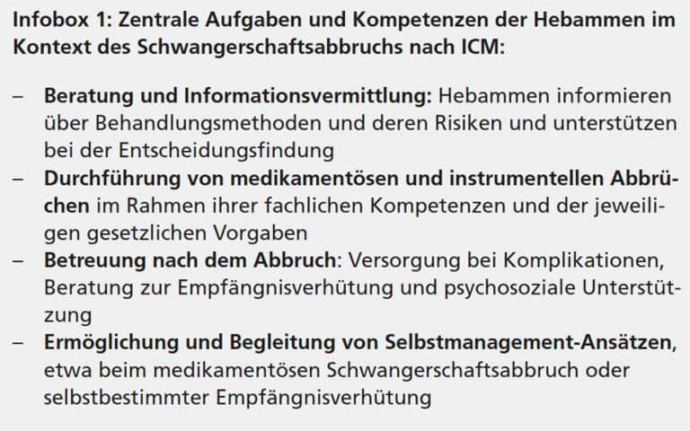 Ähnlich stellt es der ICM dar, der 2024 eine neue Version des Kompetenzrahmens für Hebammen „Essential Competencies for Midwifery Practice“ veröffentlichte. Eine grundlegende Veränderung im Kompetenzrahmen seit 2019 ist die Einführung einer neuen Kategorie Nummer zwei in den Kompetenzen mit dem Namen „Sexuelle und reproduktive Gesundheit und Rechte“. Die Hebamme wird vom ICM als ein Bestandteil der „Versorgung“ im Bereich der „sexuellen und reproduktiven Gesundheit“ dargestellt. Zur Kategorie zwei gehören Beratung und Aufklärung, einschließlich Verhütung, Vorbereitung auf eine Schwangerschaft und umfassende Betreuung bei einer Abtreibung.