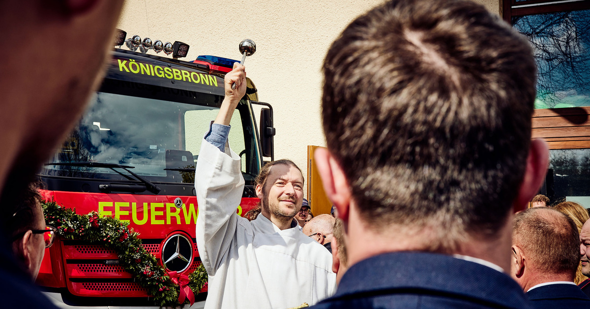 Unser Weg führt uns durch ein kleines Örtchen, wo die Menschen fröhlich zum Dorfplatz strömen. Ein Pfarrer besprenkelt hingebungsvoll mit seinem silbernen Weihwasser-Spritzgerät ein brandneues Feuerwehrauto. Das Dorf feiert seine Anschaffung und der Pfarrer sagt, dass ein geweihtes Auto ein bisschen besser löscht als irgend so ein heidnisch Dahergefahrenes.